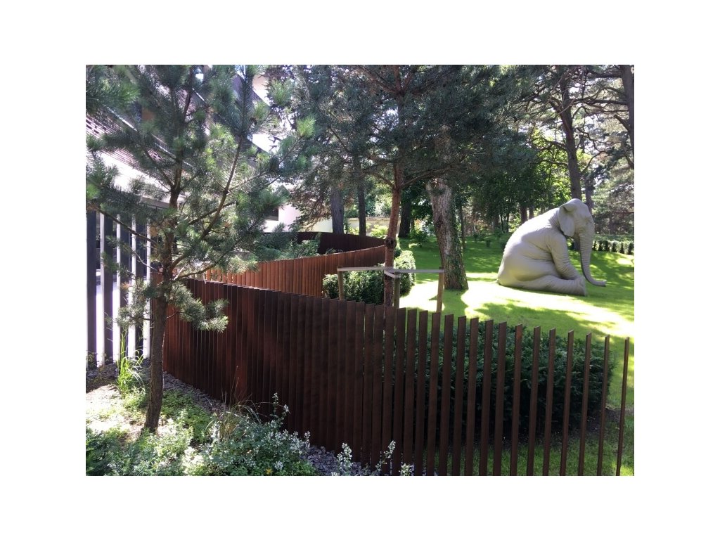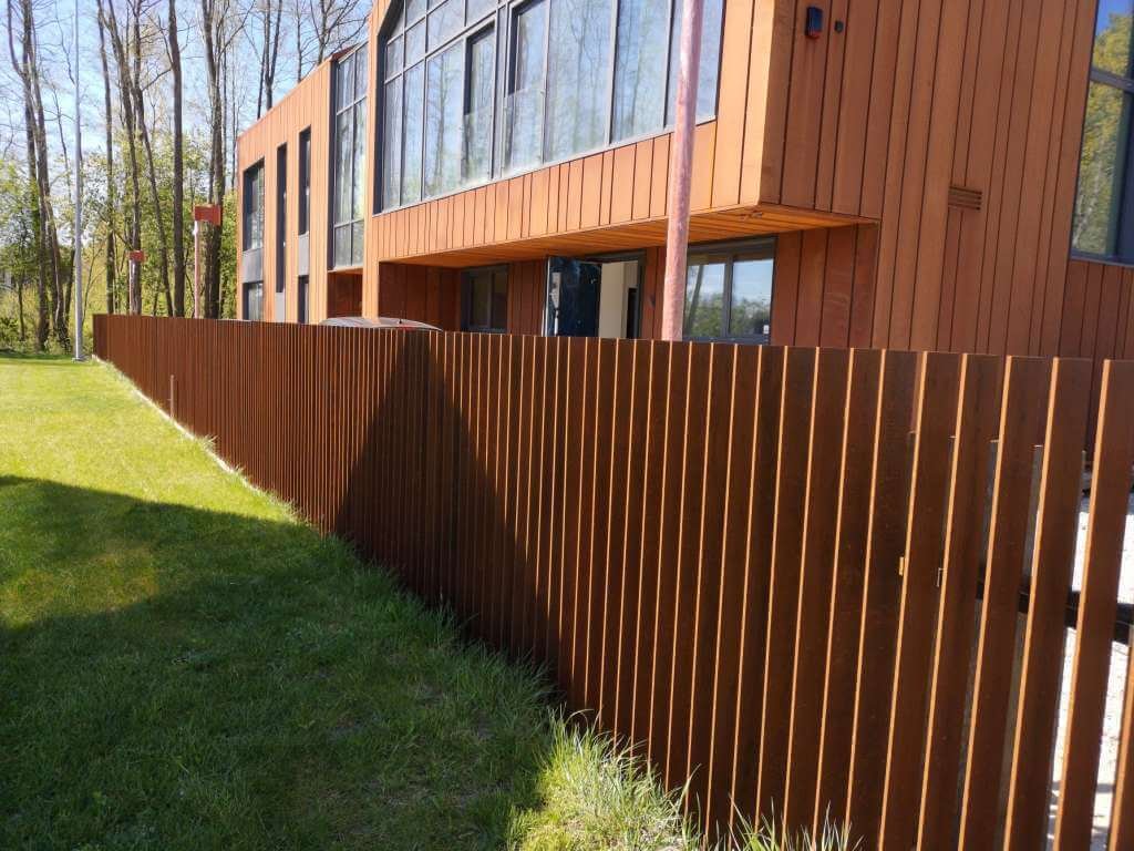 Branka k plotu EGLE. Plot EGLE z cortenové oceli má výjimečně otevřený a vzdušný design – tvoří jej vertikální lamely otočené na hranu, takže působí lehce a elegantně, přesto zůstává pevný a odolný. Teplá rezavá patina cortenu dodává modernímu provedení přirozený, nadčasový charakter.