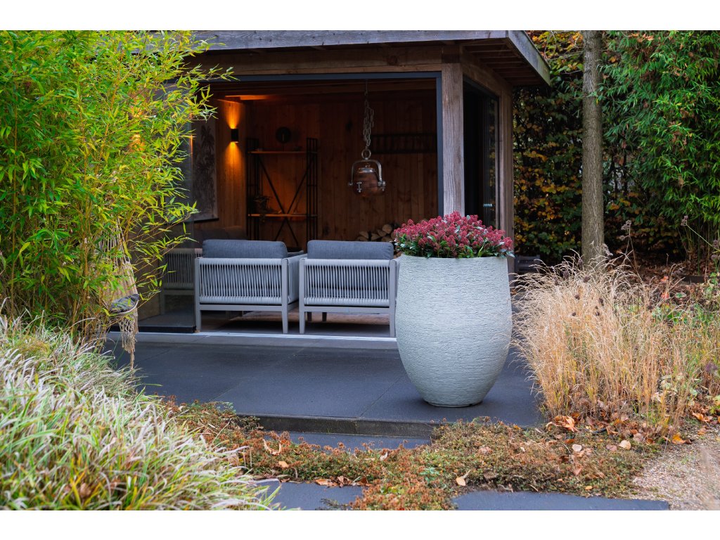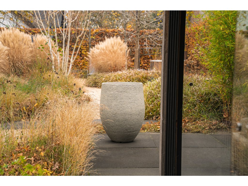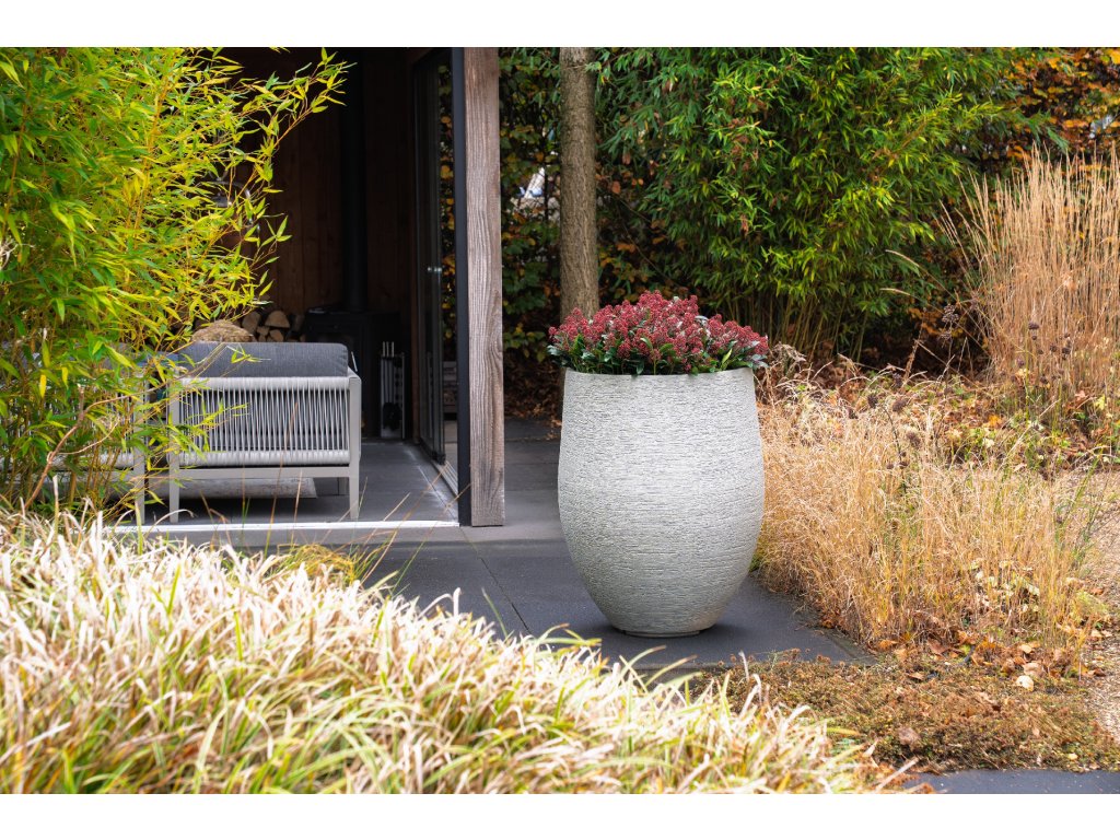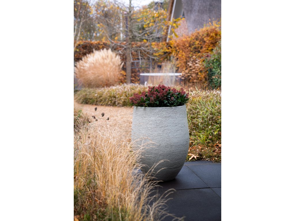 Květináč KIVO spojuje čisté linie s výrazným kamenným vzhledem. Kulatý tvar a rovná horní hrana vytvářejí klidný dojem, který doplňuje jemná, elegantní struktura povrchu.