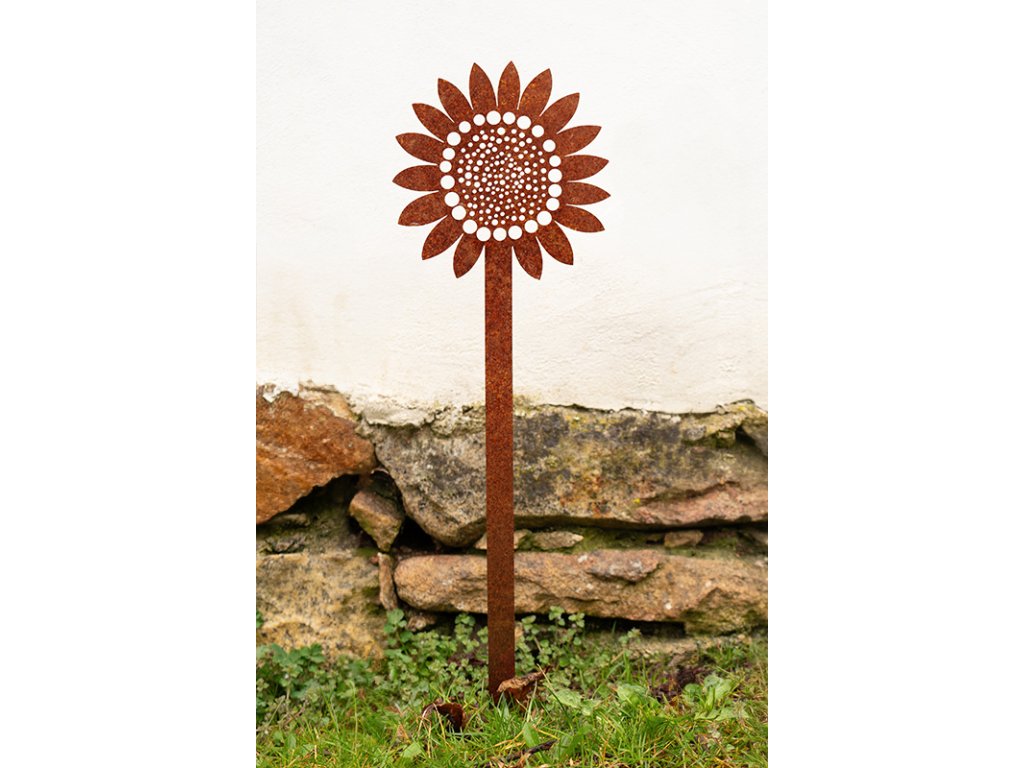 Slunečnice z cortenové oceli vnese do zahrady teplo a optimismus po celý rok. Díky zapichovacímu trnu ji snadno umístíte do záhonu, trávníku i květináče. Ani po odkvětu skutečných květů neztratí své kouzlo – její rezavý odstín září i v podzimních a zimních měsících a připomíná léto, slunce a radost ze života.