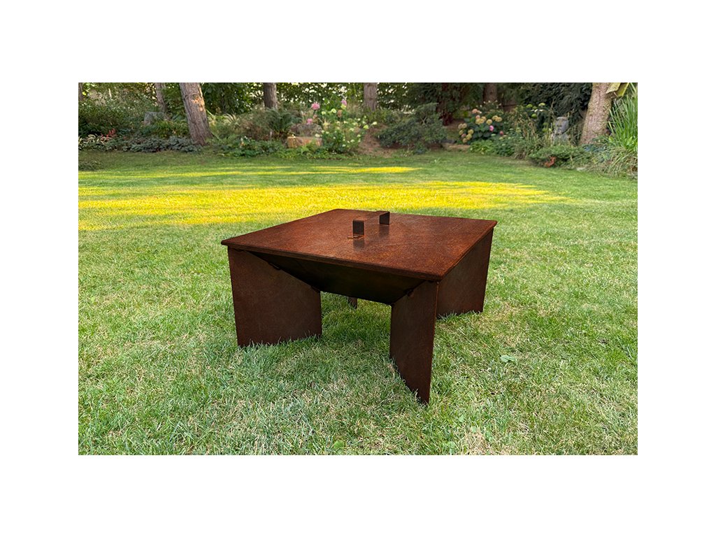 Cortenové víko na ohniště je funkční a bezpečný doplněk, který zvyšuje komfort i bezpečnost při používání ohniště. Slouží k omezení šíření plamene a umožňuje ohniště po dohoření nechat bez dozoru. Po přiklopení víko uzavře přístup vzduchu, čímž plamen přirozeně zhasne a zbylý žár bezpečně dohoří pod jeho povrchem.