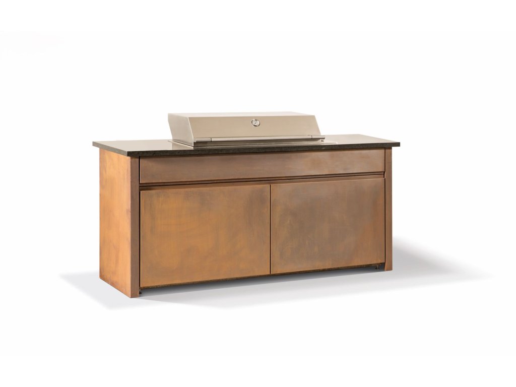 Moderní, plně vybavený kuchyňský set z cortenové oceli, odolný vůči povětrnostním vlivům a s charakteristickou patinou.